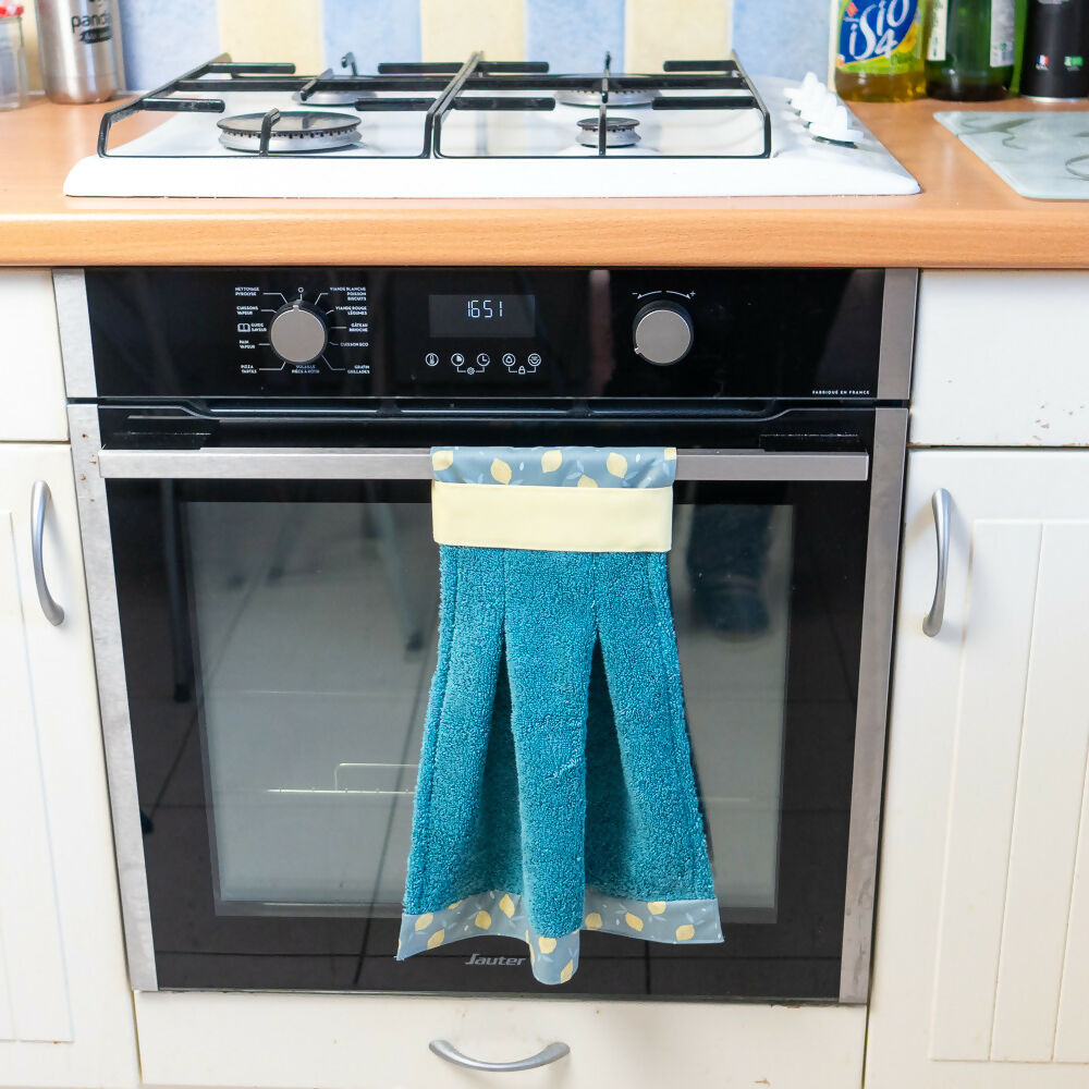 Voici un joli essuie-main pour la cuisine, très facile à accrocher autour de la poignée du four.
