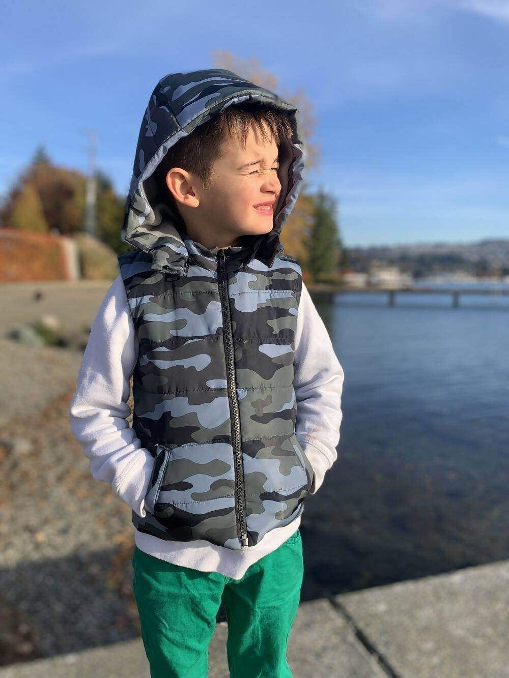 Mini-KEZIA est entièrement doublée et fermée par un zip à l’avant. Sa capuche amovible, qui pourra, au choix, être zippée par une fermeture éclair séparable, fixée par des boutons classiques ou encore des boutons pressions, ses poches raglans et sa bride de suspension sont autant de détails qui font sa singularité.