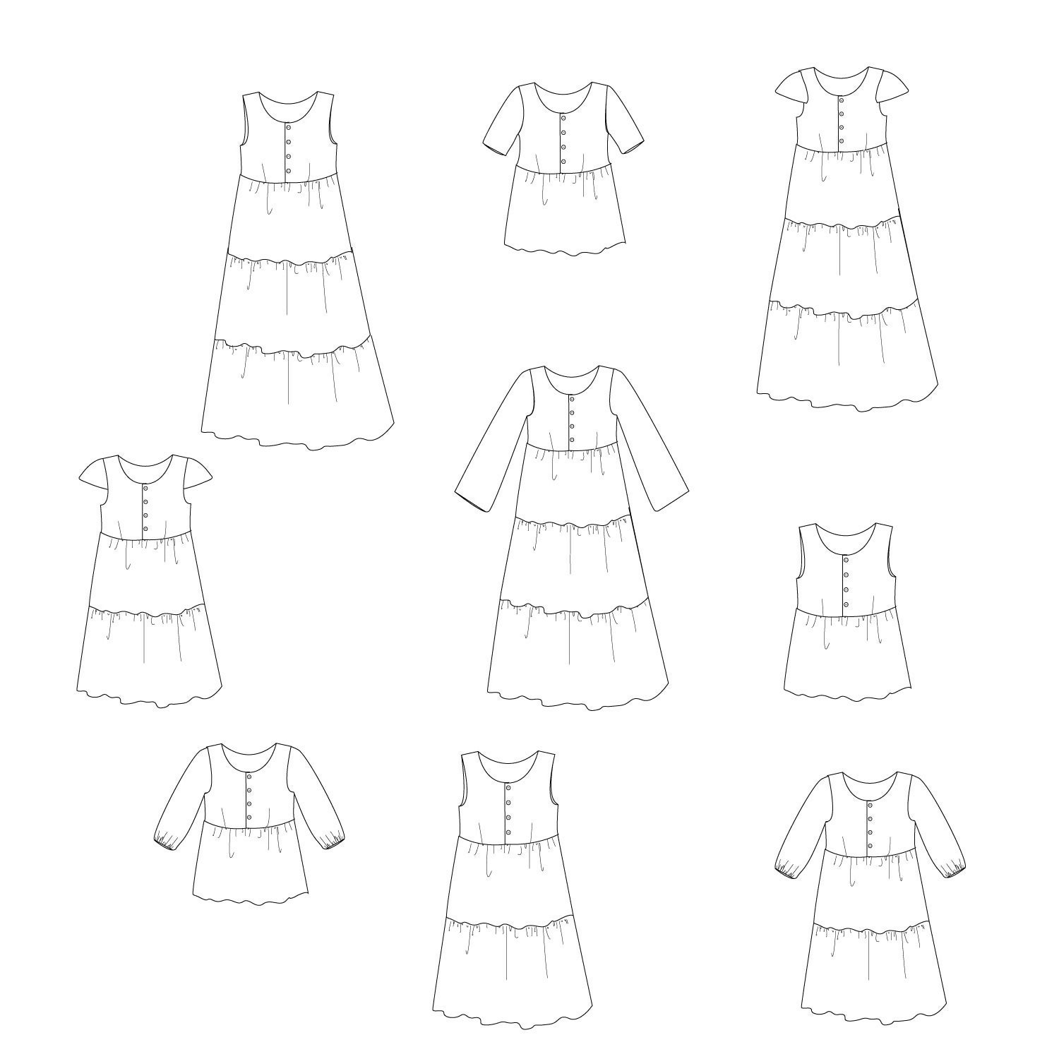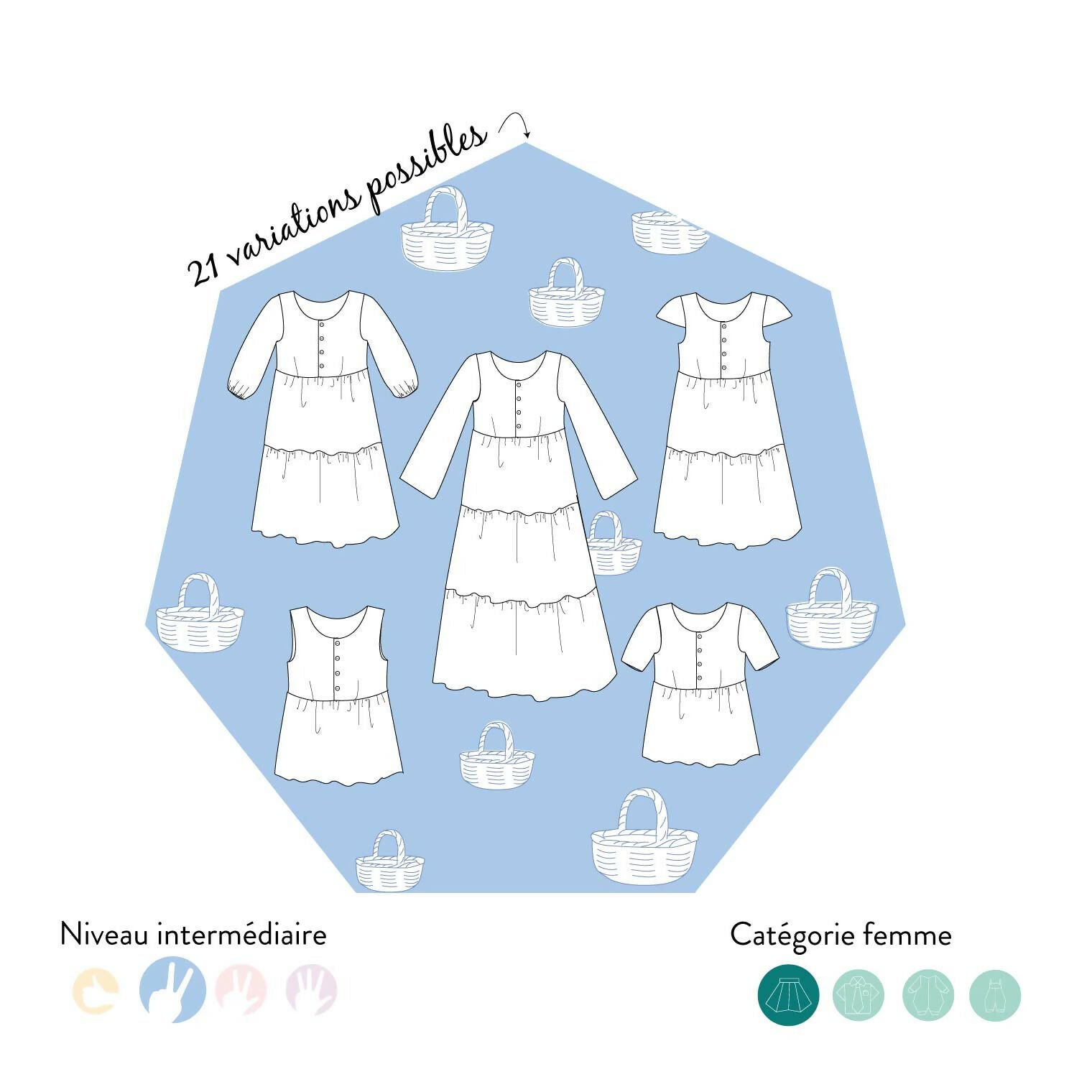 Le patron offre de multiple variation : la longueur, sans manche, manche longue, manche bouffante, manche 3 quarts, ou courte.